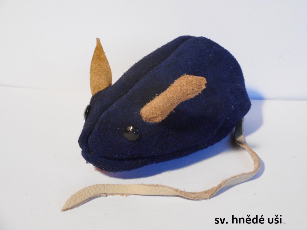 A leather key case shaped like a mouse in navy blue colour. The keys are inserted into the mouse body, the mouse belly is zipped, where is prepared the key ring for keys. The mouse holds about ten keys. Select the mouse based on the colour of its ears.