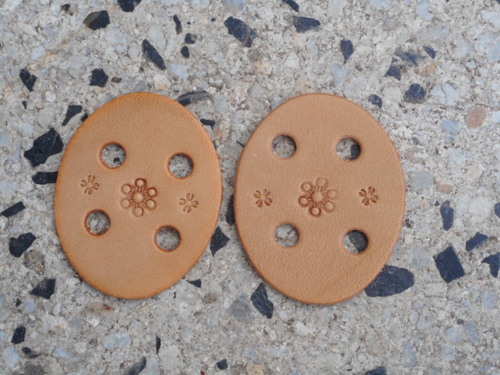 The leather foot ornament. A pair of foot leather ornaments, a decorative addition to the shoes "kristusky". Thread the shoelaces through the prepared holes in the ornament. The ornaments have a natural leather colour.
